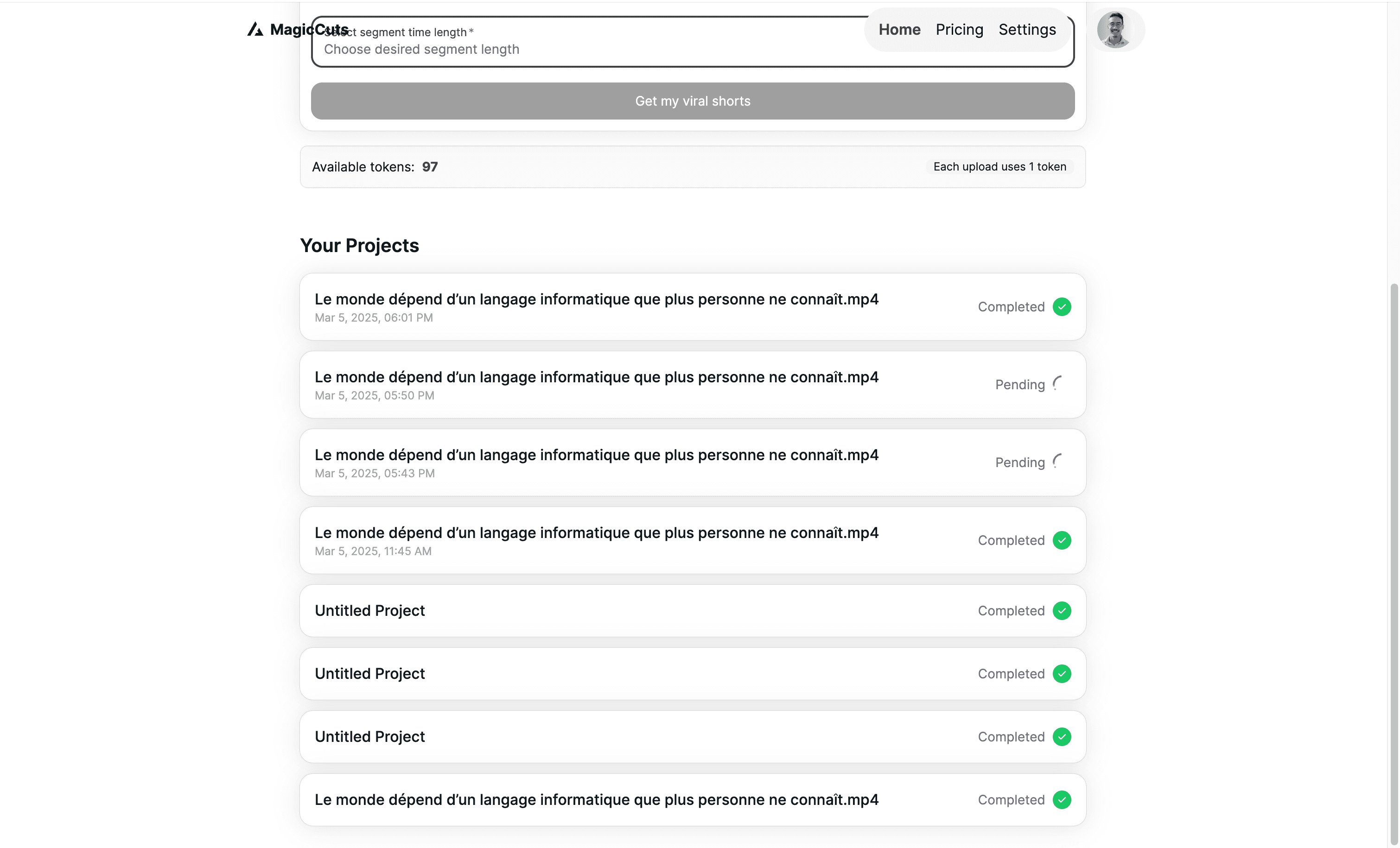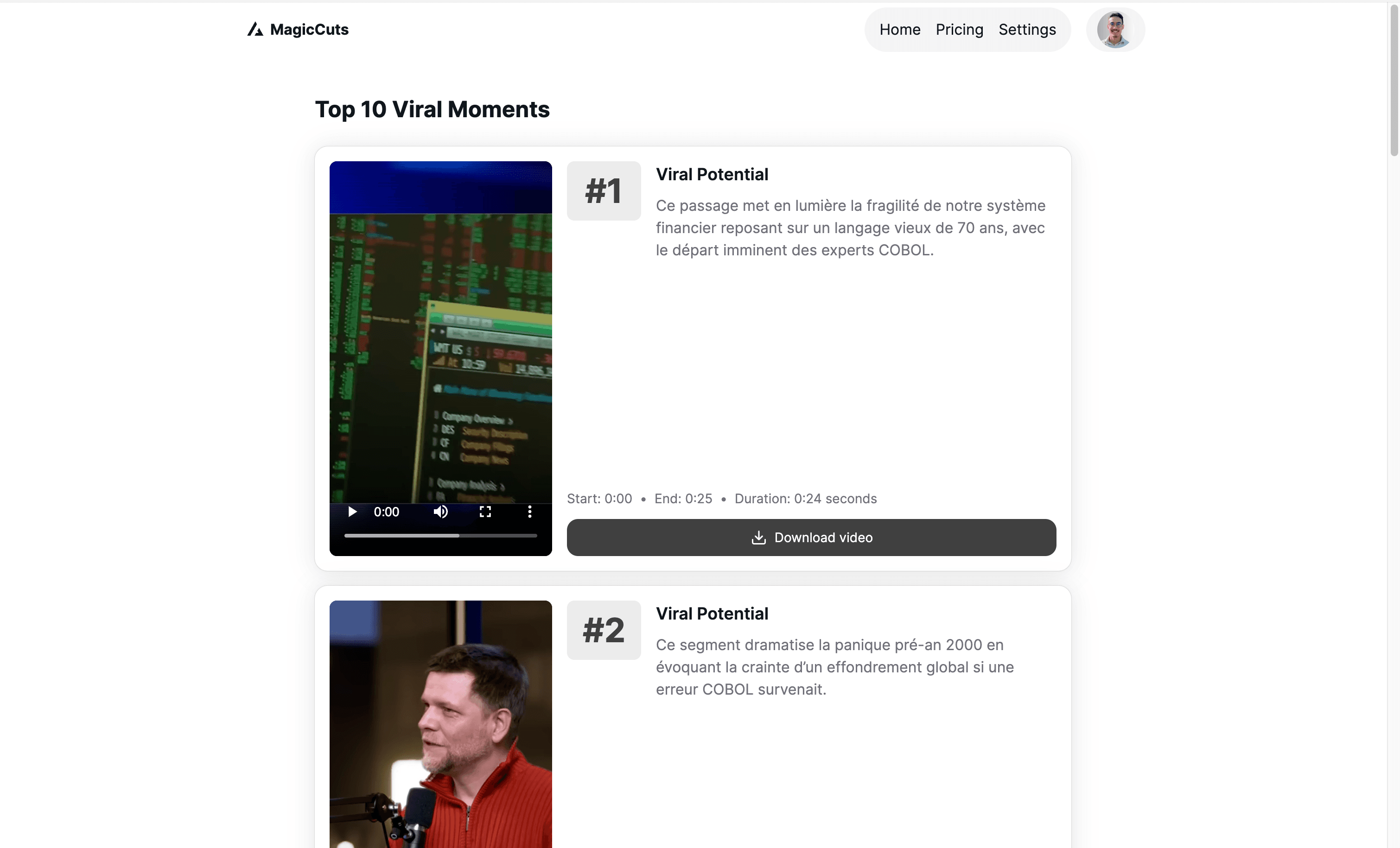 Upload your long-form content and MagicCuts will automatically identify and transform the best moments into 10 perfectly cropped vertical videos optimized for social media success.