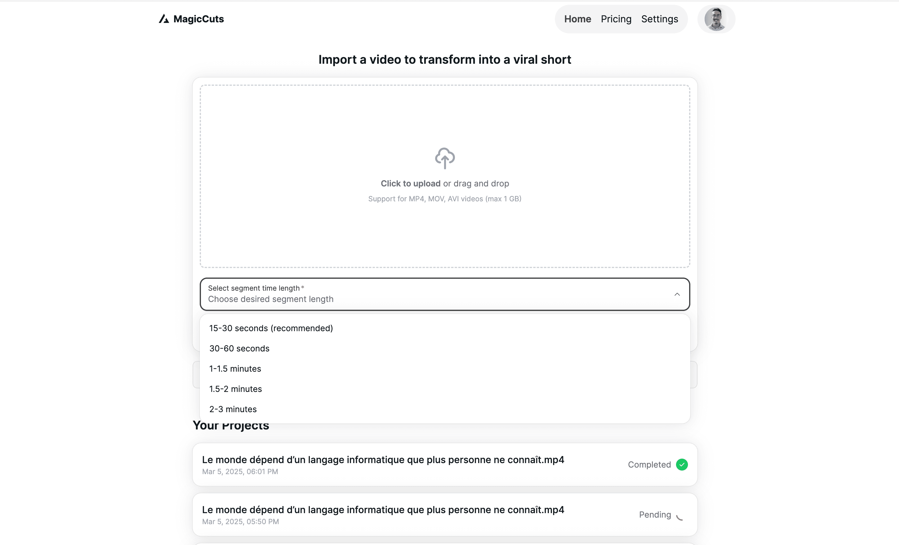 MagicCuts supports all popular video formats including MP4, MOV, AVI, and WMV. You can upload videos up to 1GB in size with no time limit constraints.